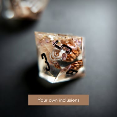 -I work entirely on my own and by hand. The process of making a beautiful handcrafted die is long and meticulous. Therefore, I cannot produce a large quantity of dice. Please fill out the form or contact me directly (via email or Instagram DM) if you're unsure about the feasibility of your project!